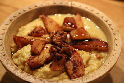 3) Toppa gröten med de stekta äpplena och nötterna och njut! Servera gärna med ett par kokta ägg vid sidan av för en mer mättande frukost. Ett annat tips är att blanda i lite proteinpulver i gröten mot slutet.